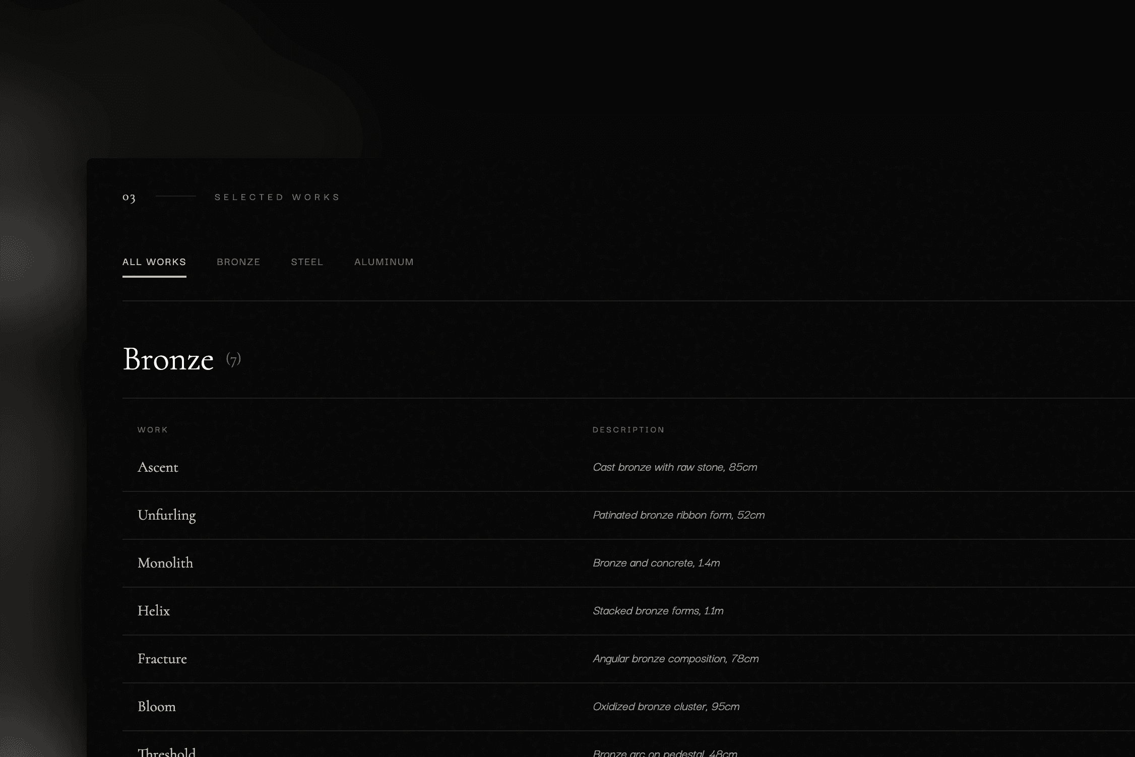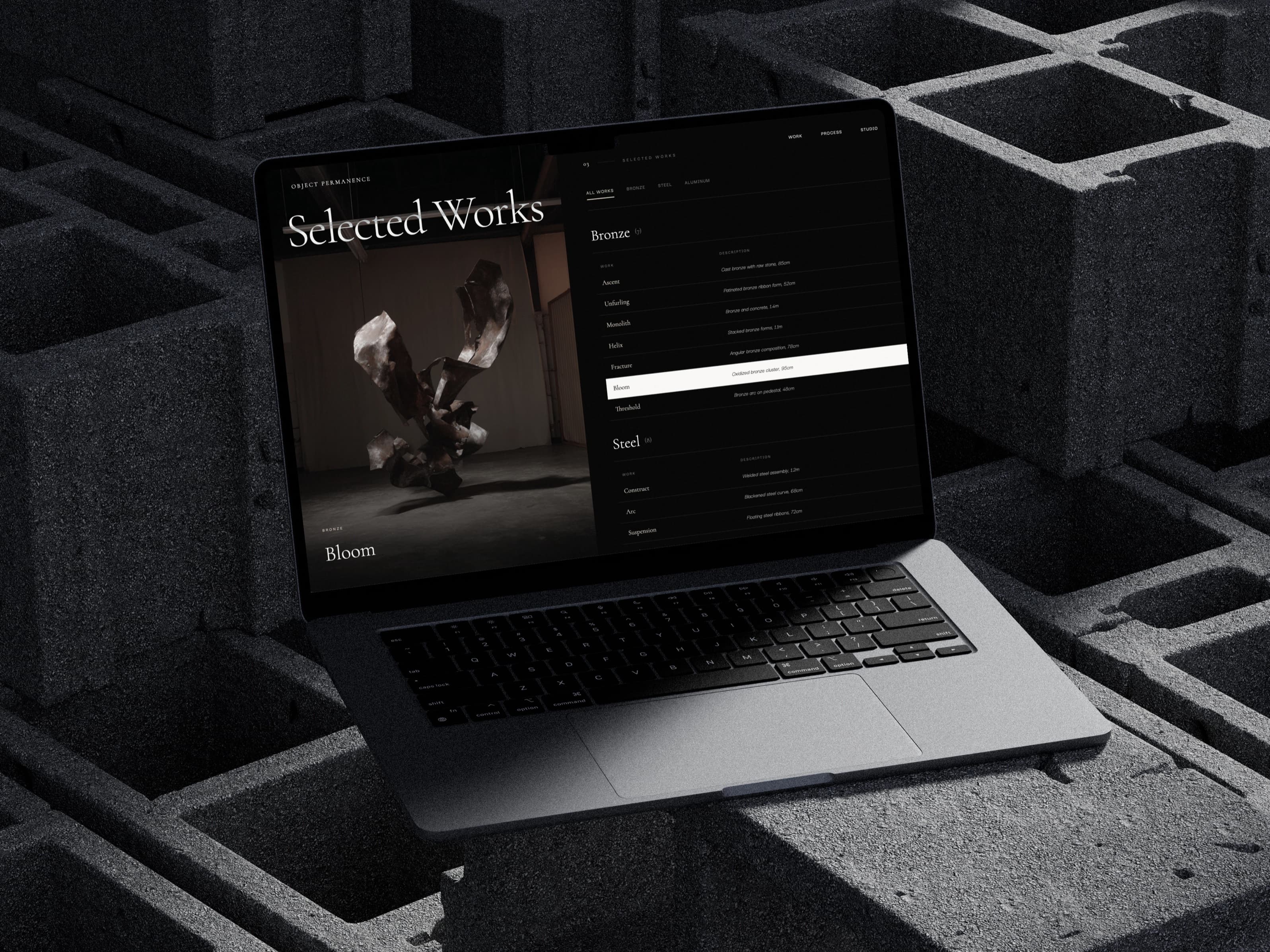 A dark, premium landing page for a fictional sculptor—exploring typography, texture, and slow, deliberate interactions