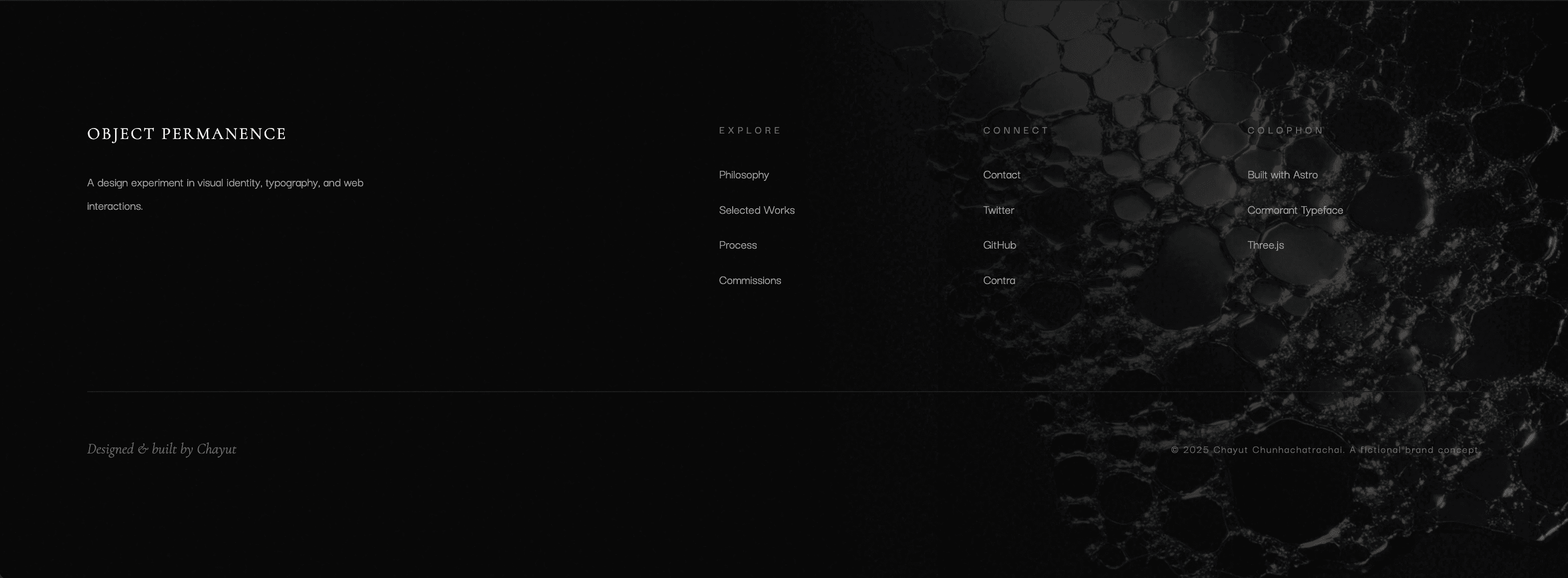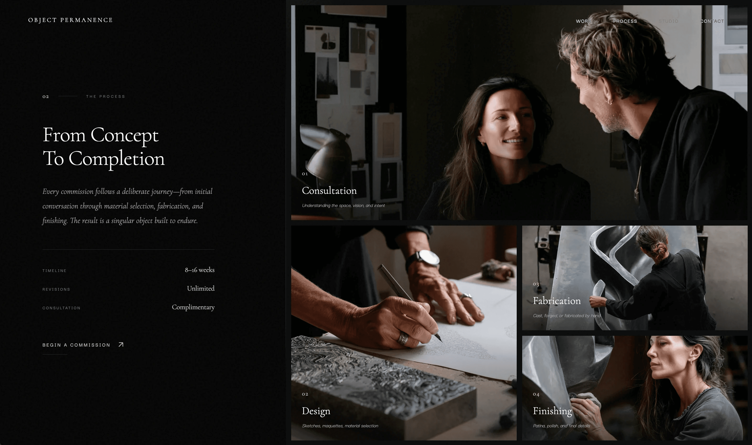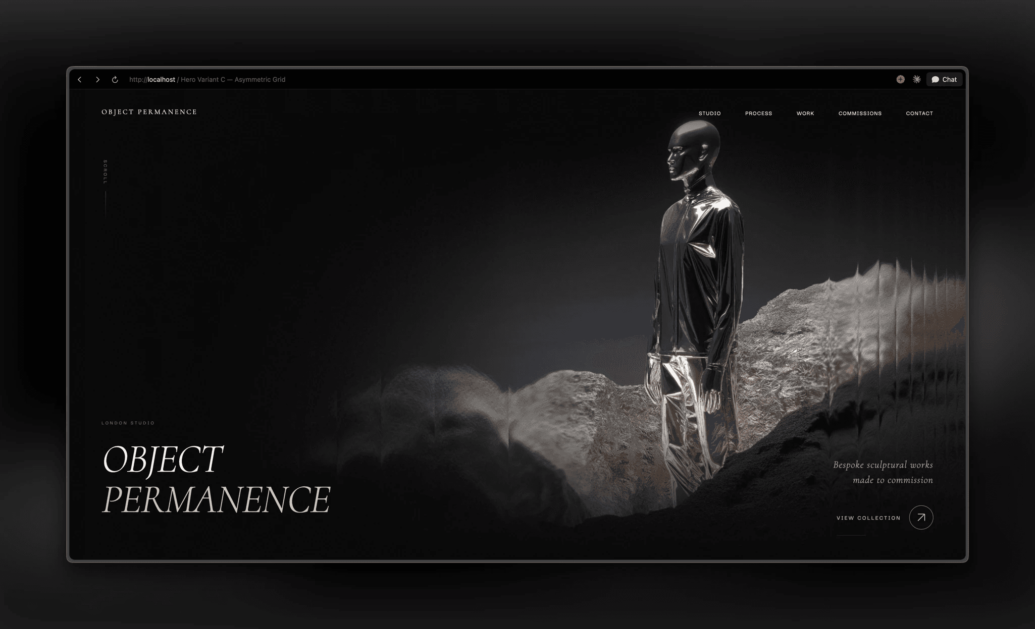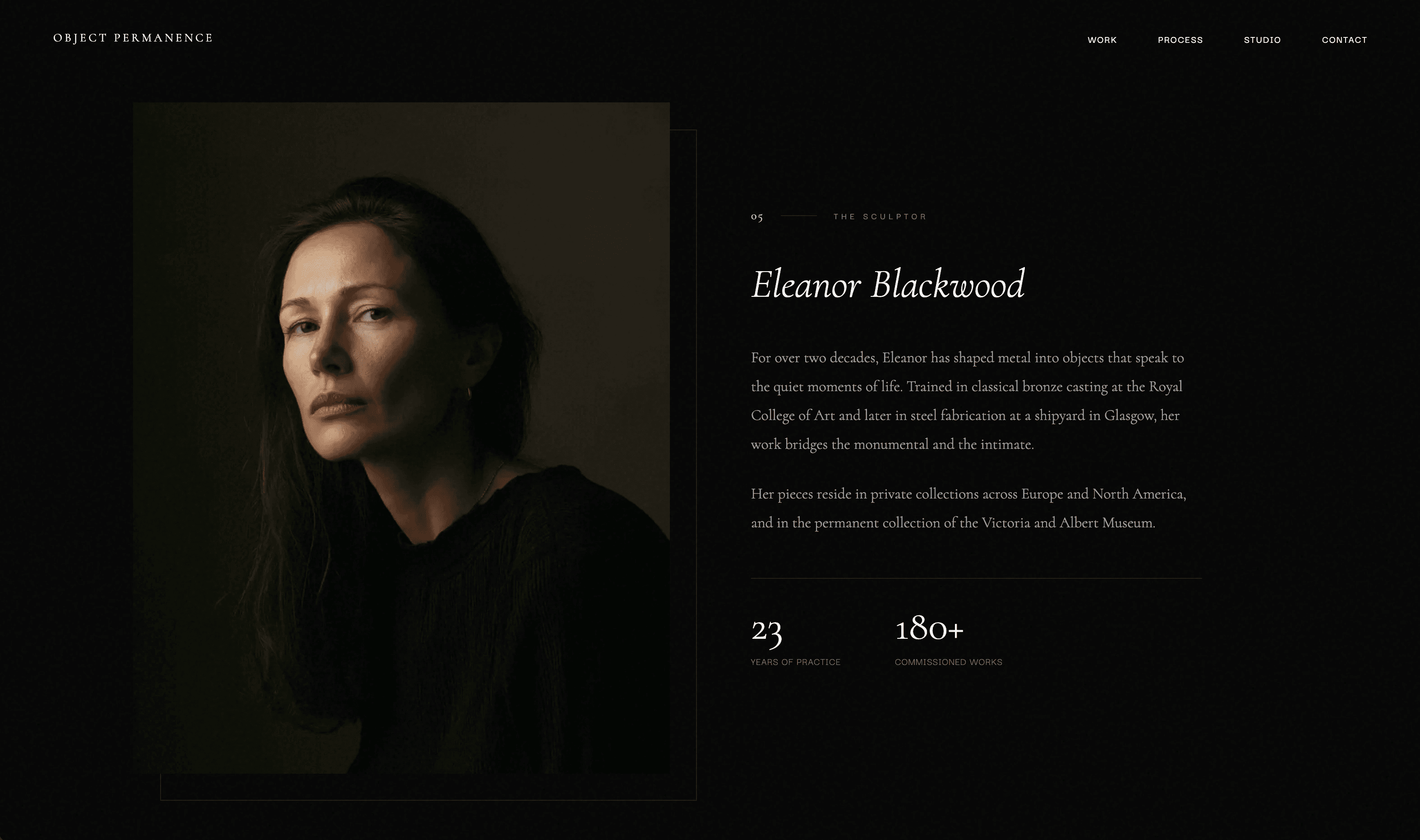 A dark, premium landing page for a fictional sculptor—exploring typography, texture, and slow, deliberate interactions